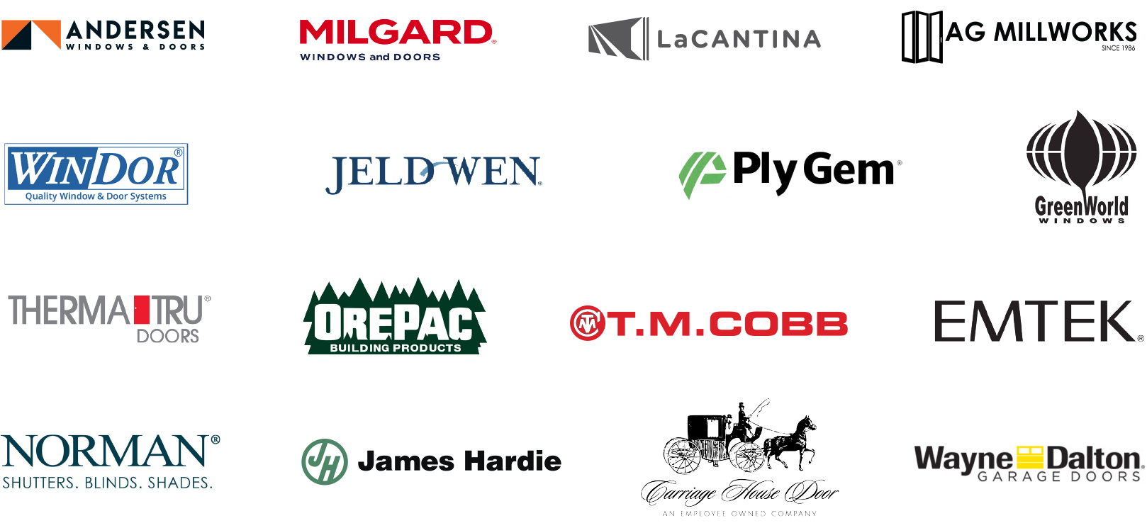 We offer a huge selection of name-brand, quality windows, front entry doors, interior and exterior French doors, sliding glass patio doors, moving glass walls, plantation shutters and shades, home siding and more, by manufacturers such as Andersen, Milgard, La Cantina, AG Millworks, WinDor, Jeld-Wen, Ply Gem, Green World, Therma-Tru, Orepac, T.M. Cobb, Emtek, Norman, James Hardie, Carriage House Door and Wayne Dalton.